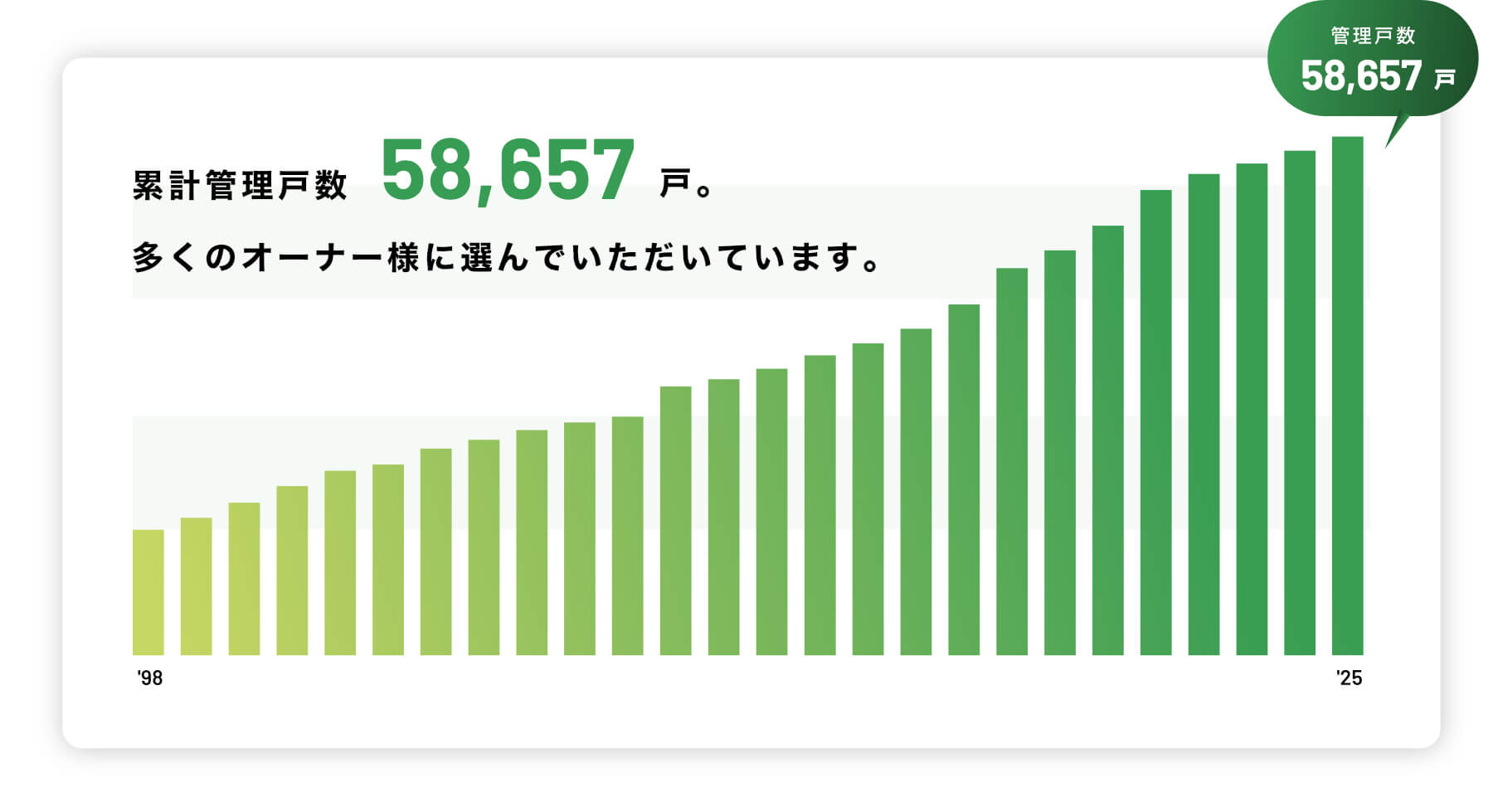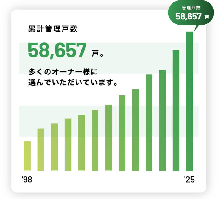 自社ポータルサイトでは常時10万件の情報を公開してWEB集客に努め、業務提携先は大学生協・上場企業など実に170社以上と行うなど、集客の相乗を積極的に狙い、結果として管理物件の平均入居率は結果として~98.7%以上と高い水準を維持しています。